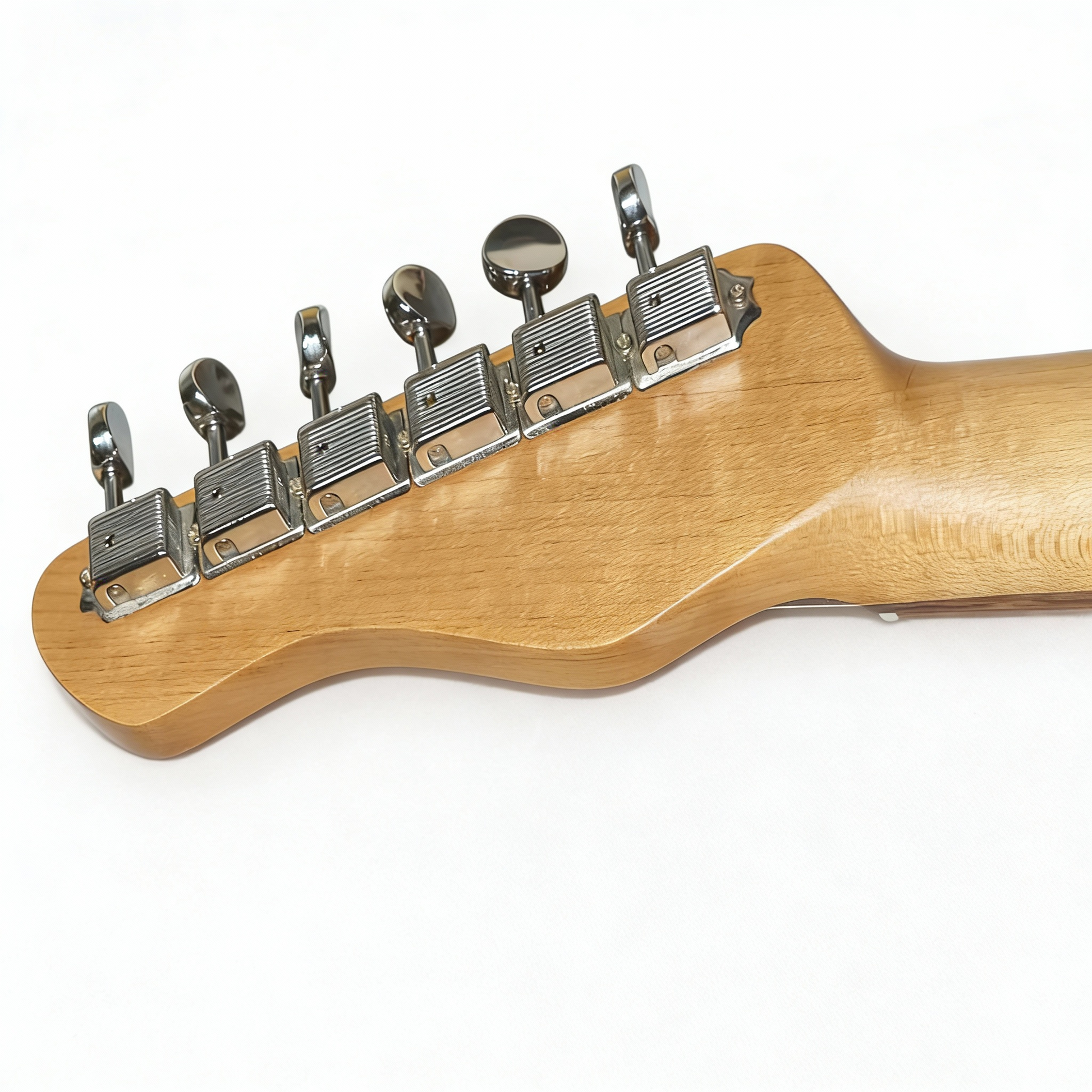 Equipped with versatile HSS pickup setup, offering crisp single-coil clarity and humbucker power, paired with vintage-style tuners for stable tuning and classic tonal character.